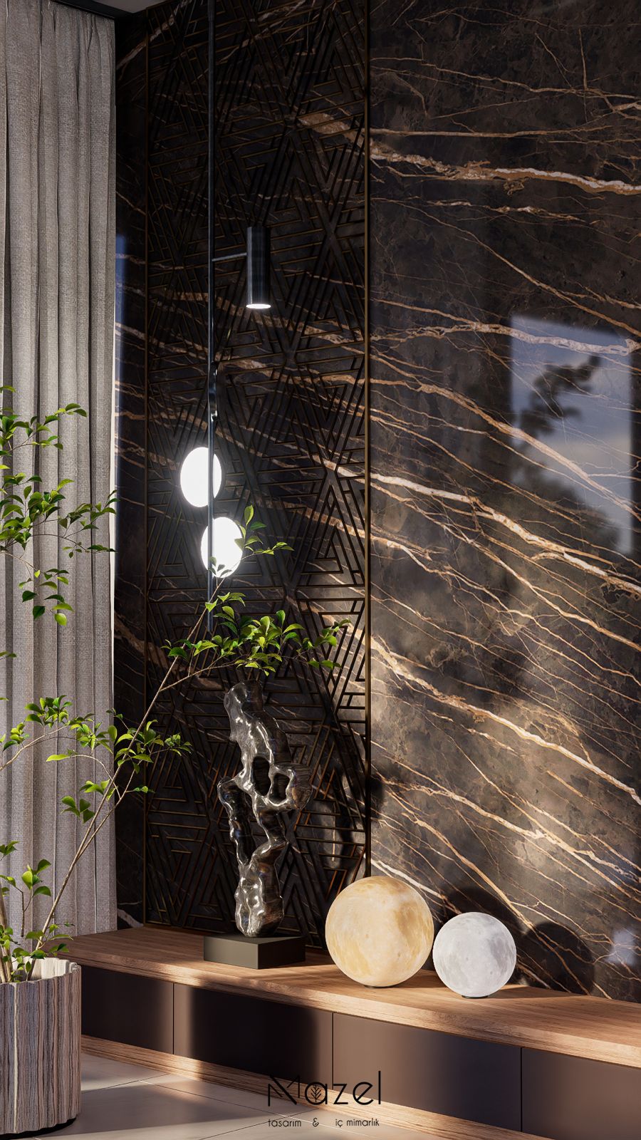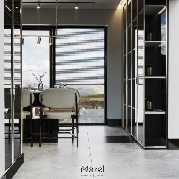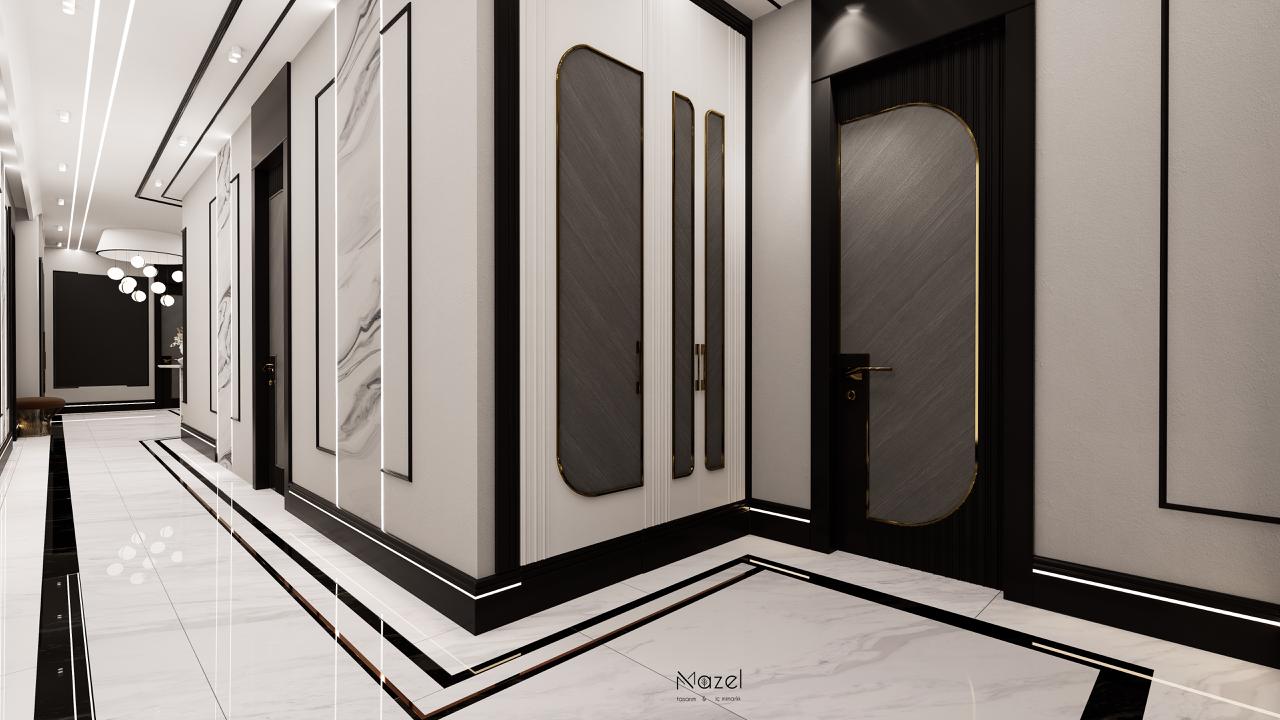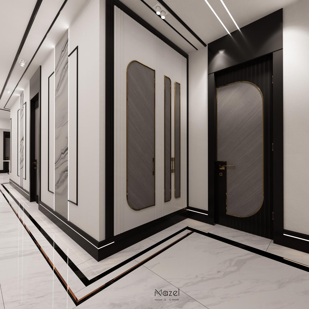 Bu projede, klasik çizgilerin modern dokunuşlarla yeniden yorumlandığı bir koridor tasarımı oluşturduk. Mermer detaylar, siyah çerçeveler ve aydınlatma çizgileriyle mekâna derinlik kazandırıldı. Her detayıyla sade ama güçlü bir atmosfer hedeflendi; ilk adımda zarafeti hissettiren bir giriş alanı tasarlandı.