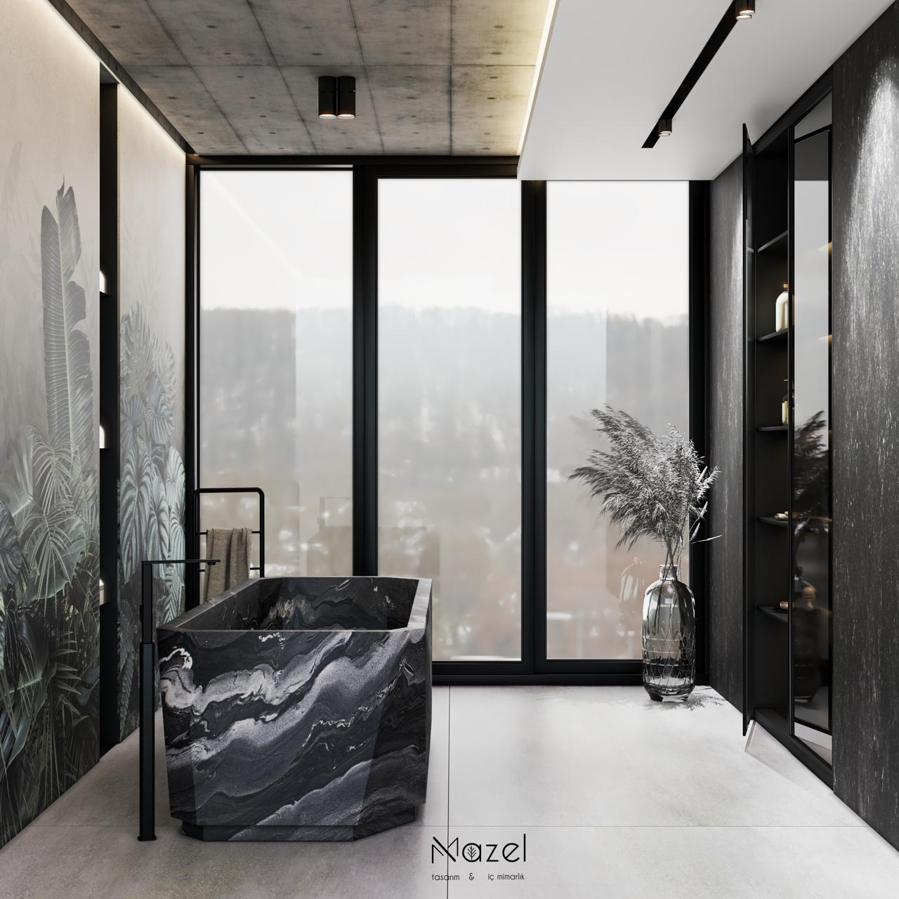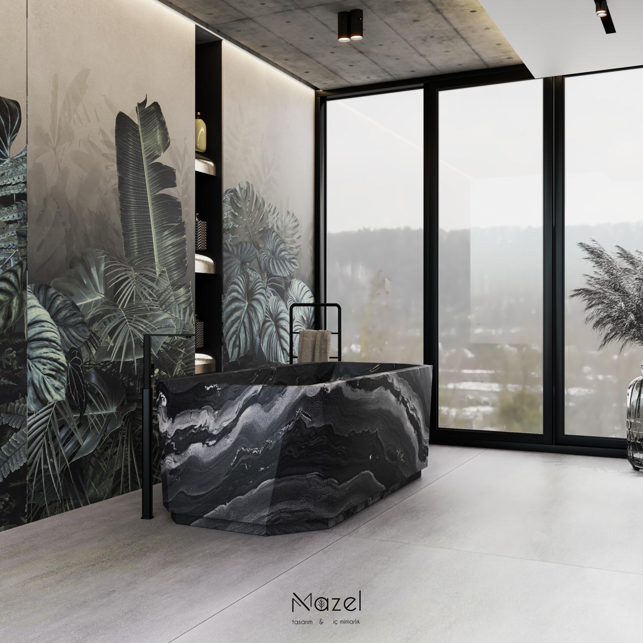 Mekan, modern brütalizmin ham dokusunu biyofilik tasarımın dinginliğiyle harmanlayan sofistike bir banyo deneyimi kurguluyor. Odanın tartışmasız odak noktası olan monolitik siyah mermer küvet, yüzeyindeki dramatik beyaz damarlar ve fasetli geometrik formuyla heykelsi bir duruş sergilerken; arka plandaki devasa tropikal botanik duvar paneli, mekana derinlik ve organik bir hareket katıyor. Tavanın brüt beton dokusu ile zemindeki geniş formatlı nötr seramikler arasındaki endüstriyel denge, panoramik siyah çerçeveli doğramalar sayesinde içeri süzülen diffüz gün ışığıyla yumuşatılıyor; bu da nişlerdeki gizli LED aydınlatmalarla desteklenen, dışarıdaki sisli manzara ile bütünleşmiş, zamansız ve yüksek lüks standartlarında bir atmosfer yaratıyor.