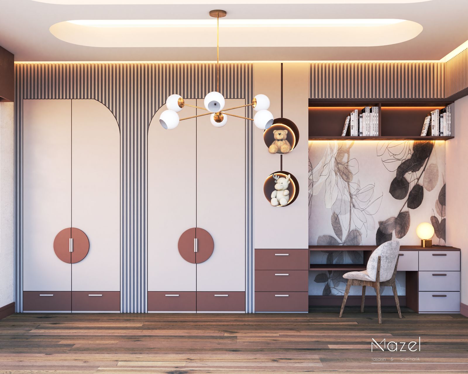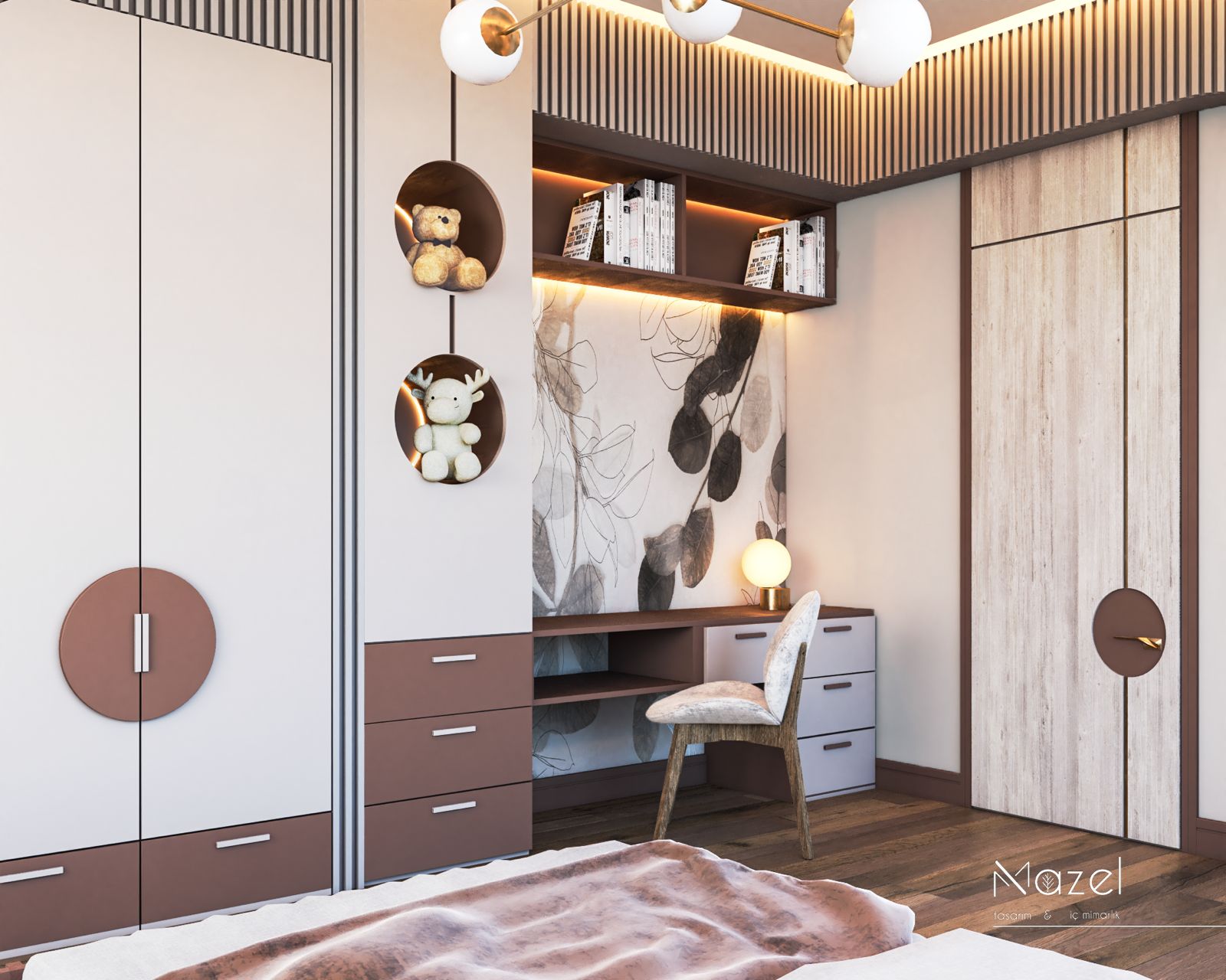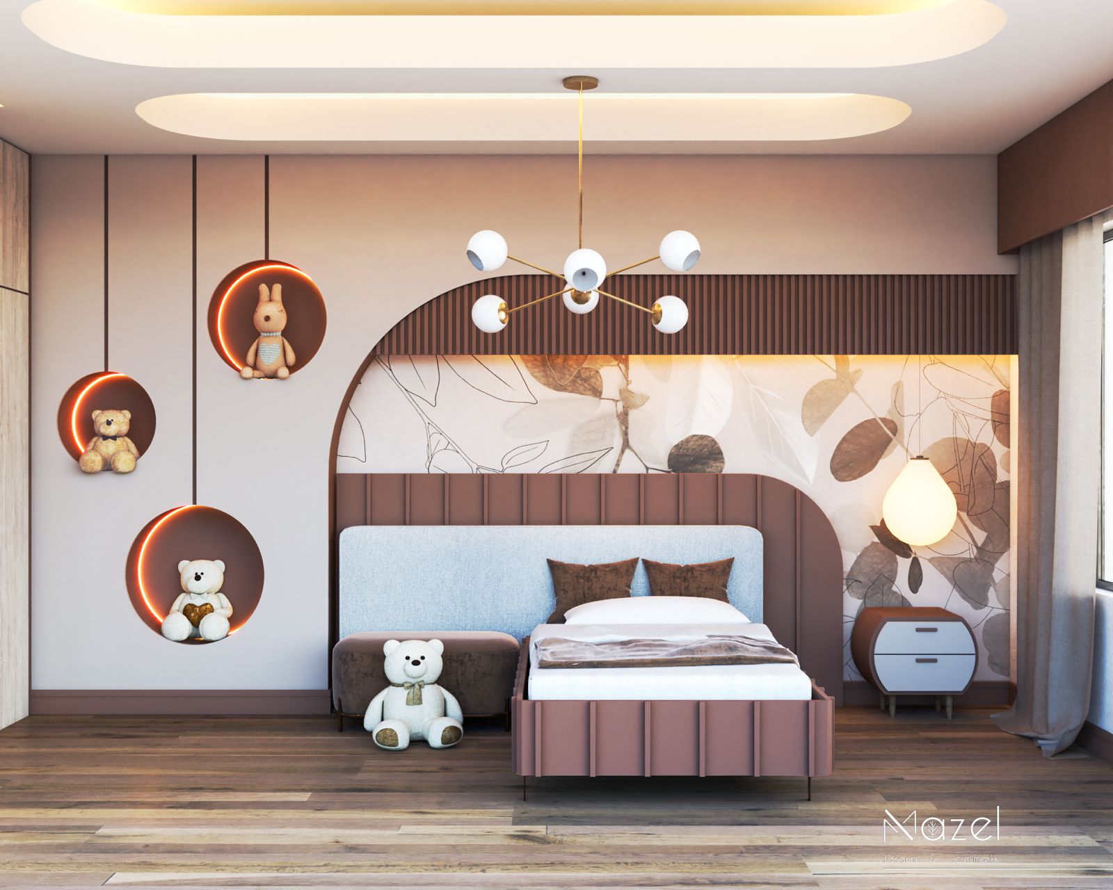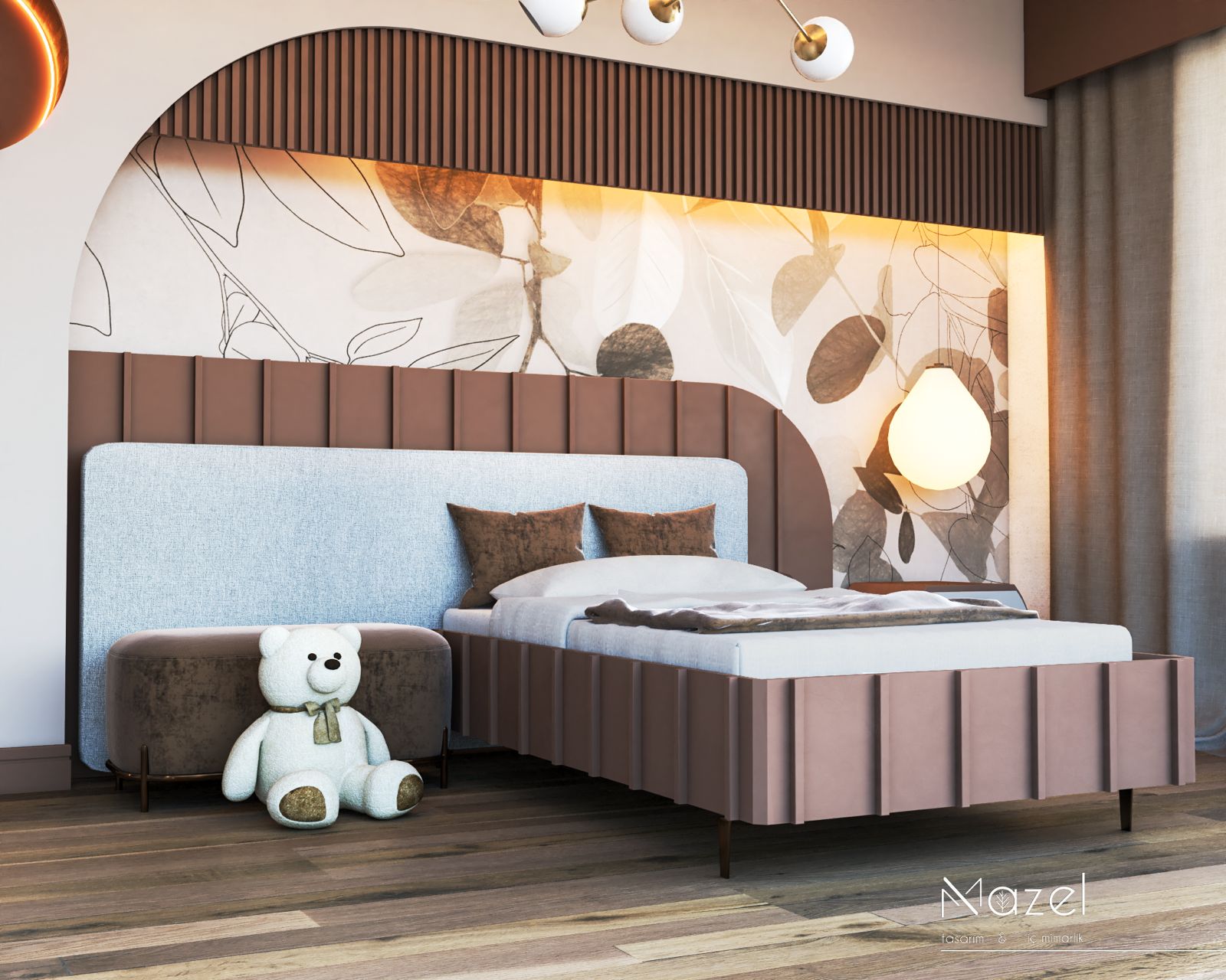 Tasarım, modern minimalizmin sıcak toprak tonlarıyla harmanlandığı, çocuk psikolojisine uygun sakinleştirici ve güvenli bir atmosfer yaratmayı hedefler. Mekanın aydınlatma senaryosu, tavandaki kademeli asma tavan içerisine gizlenen endirekt LED ışık bantları ve duvara gömülü dairesel nişlerin (display ünitelerinin) çevresine entegre edilen amber tonlu vurgu aydınlatmalarıyla katmanlandırılarak mekana derinlik kazandırılmıştır. Ana odak noktası olan yatak başı duvarında, asimetrik kavisli bir hatla ayrılan ahşap lata (slat) paneller ve monokrom botanik desenli duvar kağıdı kullanılarak malzeme geçişleri arasında güçlü bir dokusal kontrast oluşturulmuştur. Mobilya detaylarında çocuk güvenliği esas alınarak keskin köşelerden kaçınılmış, yatak bazasında ve komodinde kavisli, oluklu (fluted) yüzeyler tercih edilirken, zemin döşemesinde kullanılan eskitme meşe parke ve akustik konforu artıran kumaş başlık, mekanın teknik altyapısını estetik bir bütünlükle tamamlamaktadır.