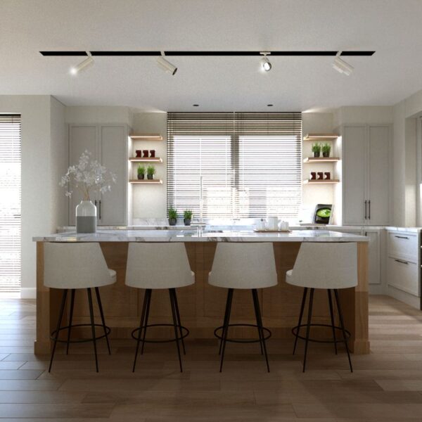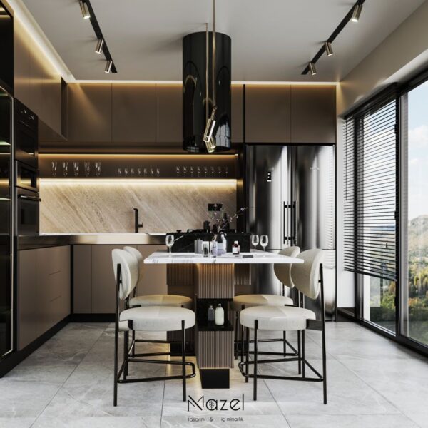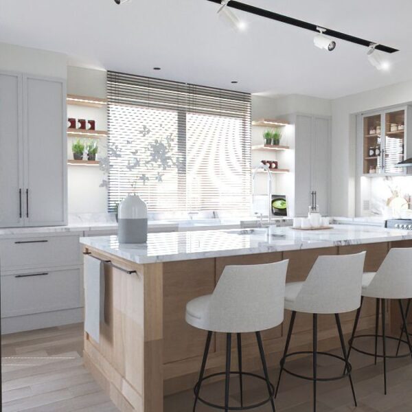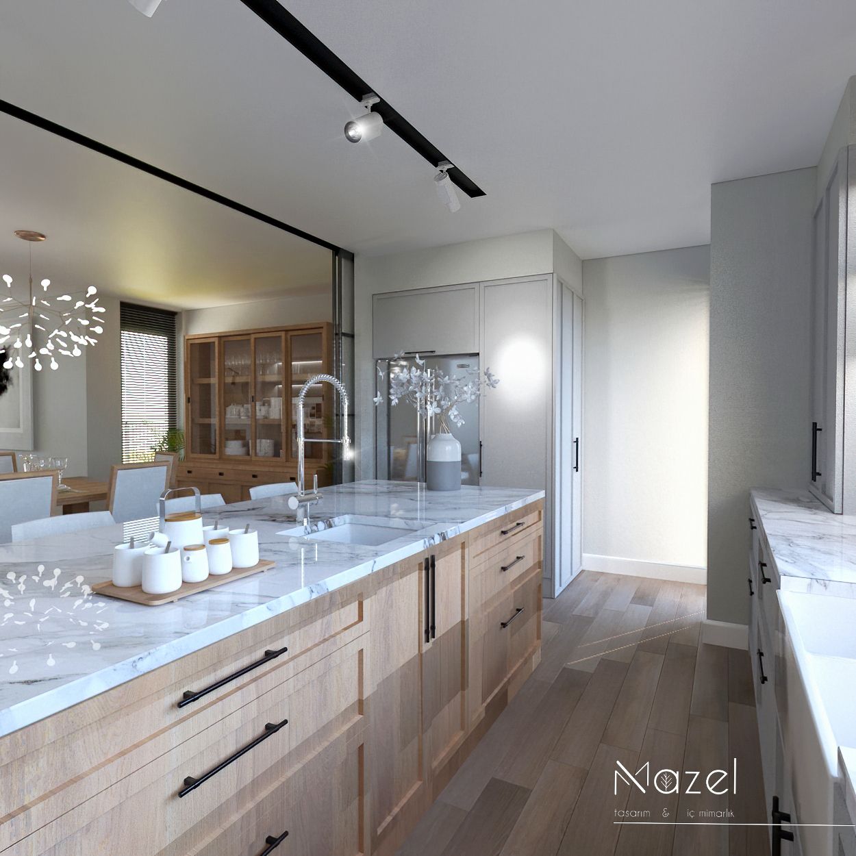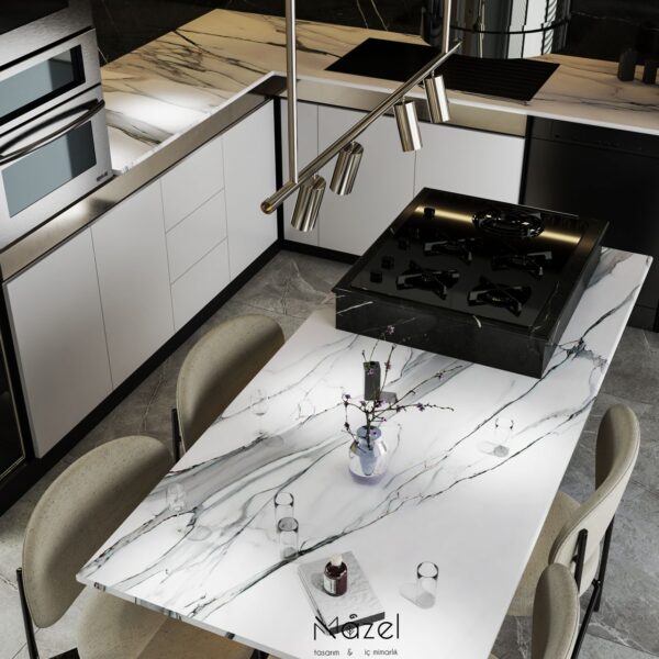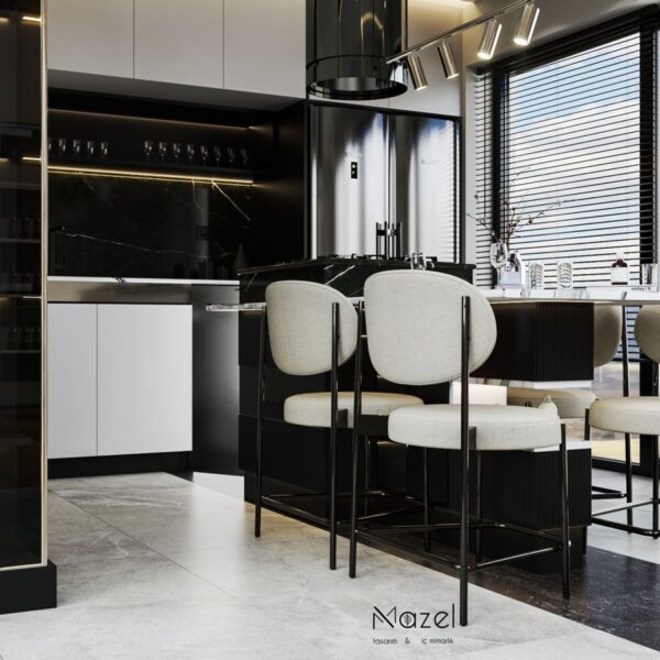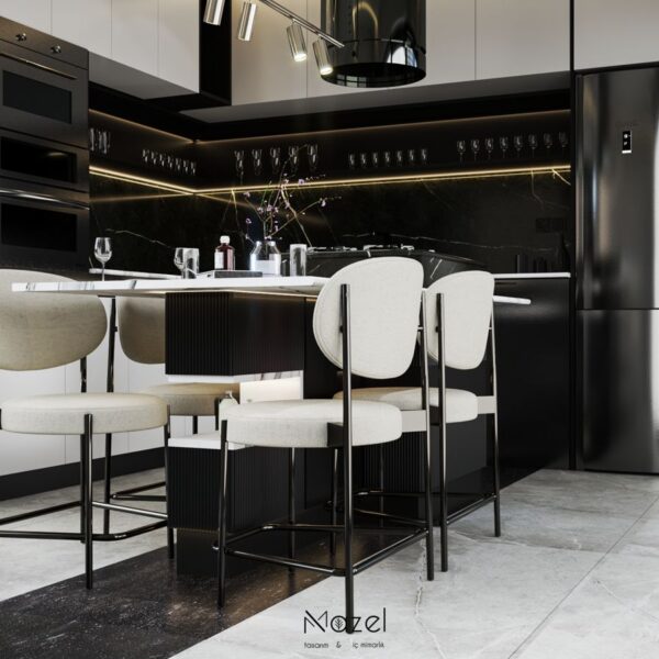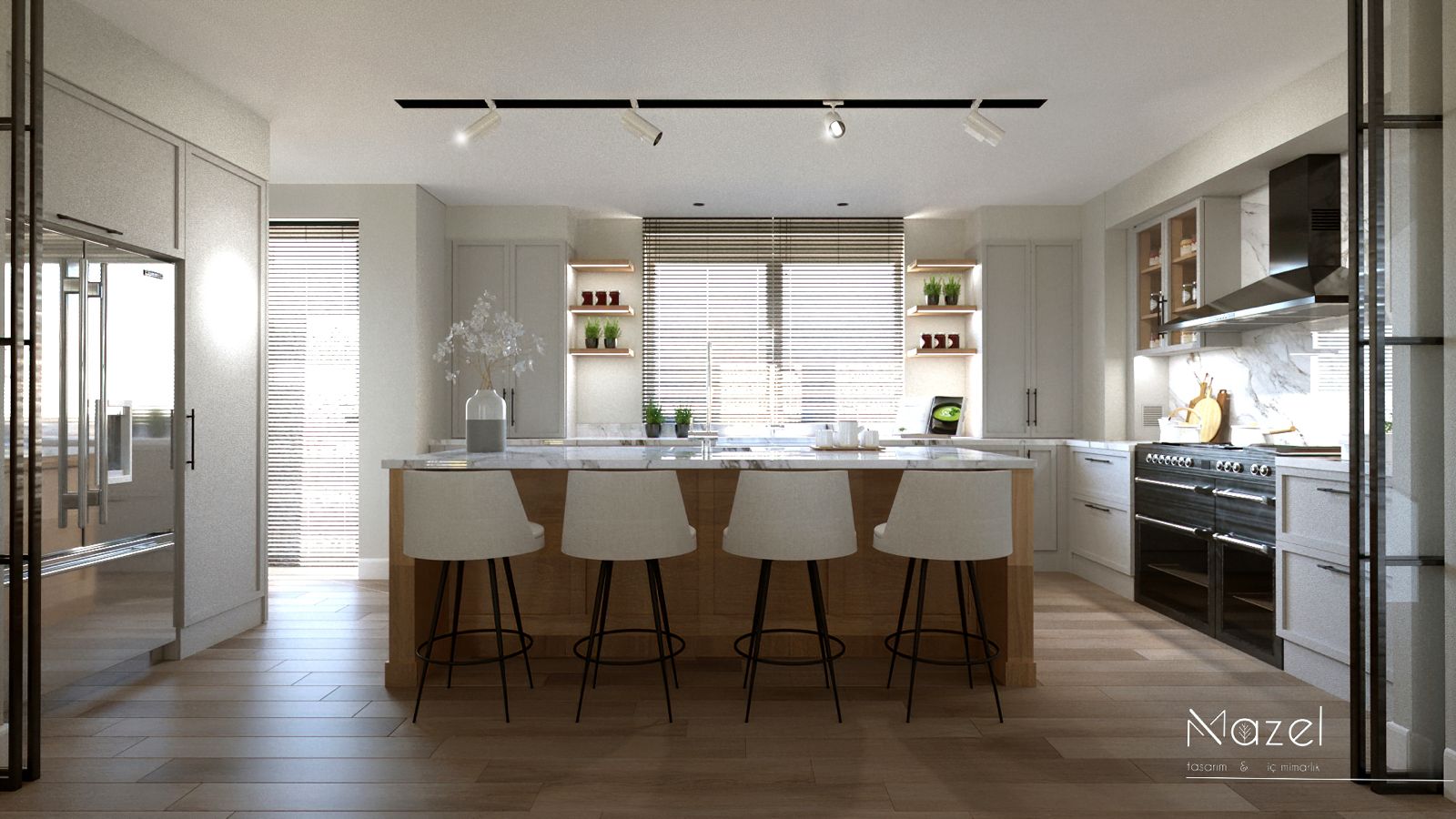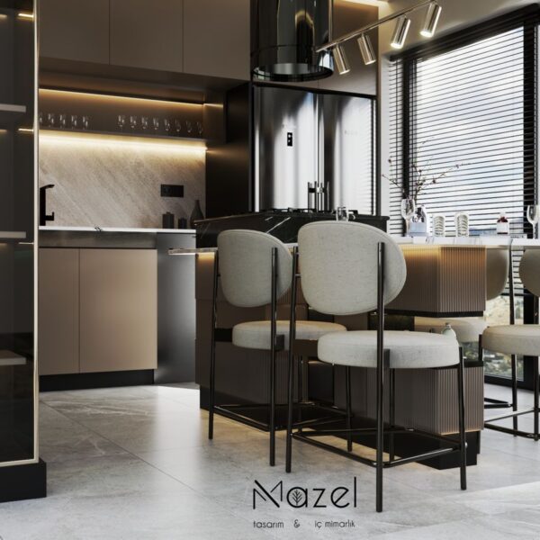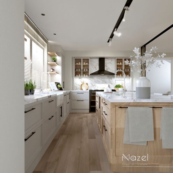 Bu proje, "Transitional" (Geçişsel) tasarım dilini benimseyerek, klasik "Shaker" stilinin sıcaklığını modern endüstriyel detaylarla harmanlayan ferah bir mutfak deneyimi sunar. Mekanın merkezine konumlanan geniş ada ünitesi, doğal meşe dokusu ve beyaz mermer tezgahın birlikteliğiyle hem fonksiyonel bir hazırlık yüzeyi hem de sosyal bir odak noktası oluştururken; çevreleyen gri mat lake dolaplar ve simetrik açık raf sistemleri, depolama hacmini görsel olarak hafifletmiştir. Zemin döşemesinde kullanılan sıcak ahşap parke, yaşam alanıyla mutfağı ayıran siyah demir doğramalı kayar cam panellerin (sliding doors) grafik etkisiyle kontrast oluşturur; tavandaki siyah manyetik ray spotlar ve mat siyah kulp detayları ise mekana ritmik ve modern bir karakter kazandırır.