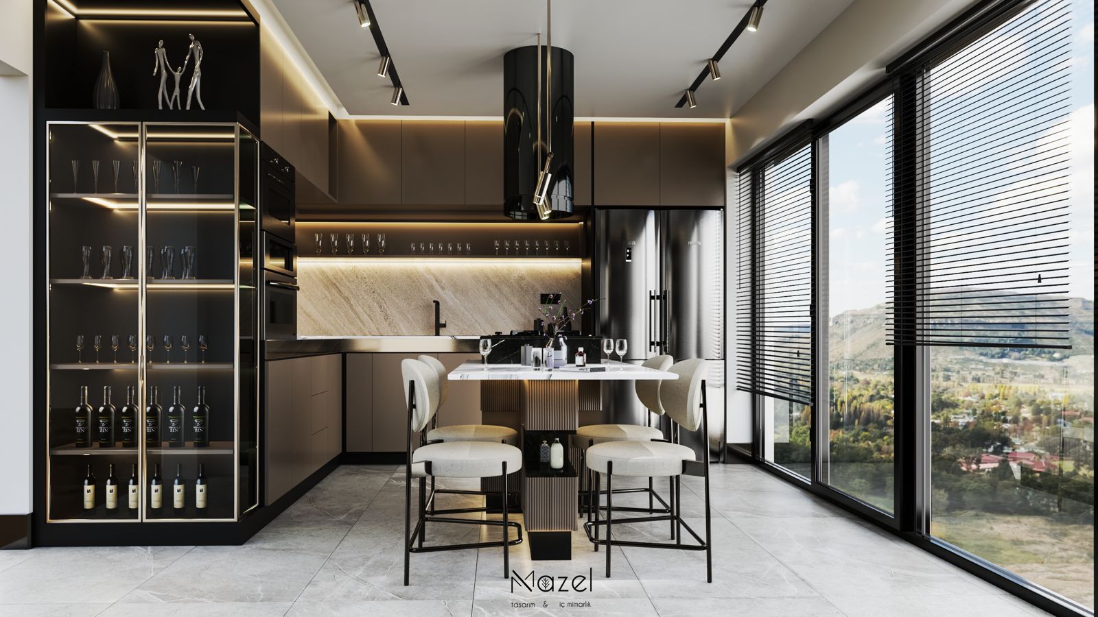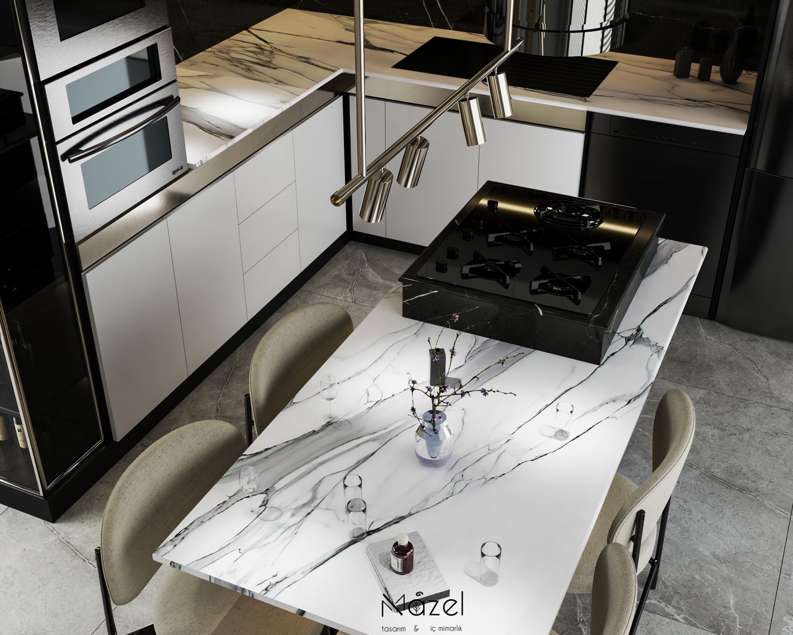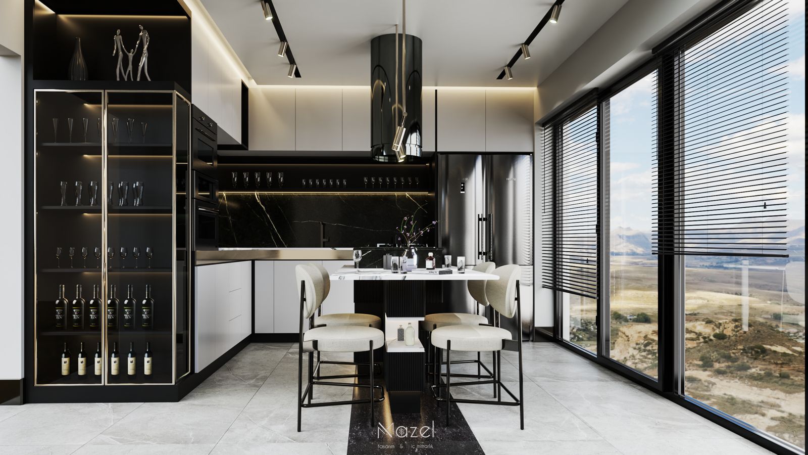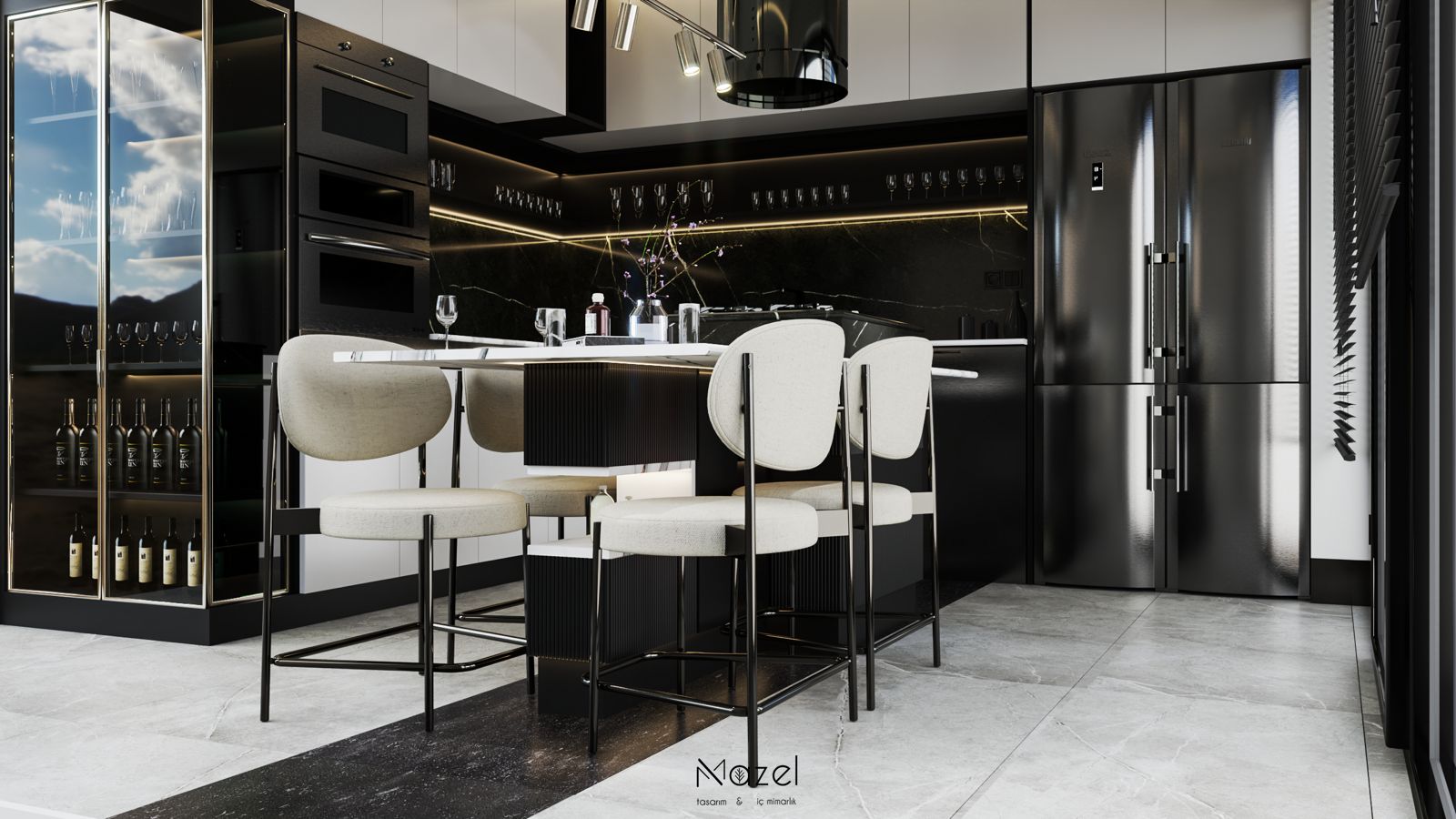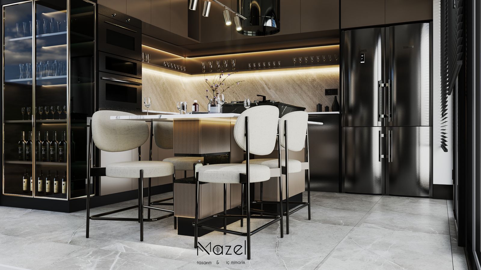 Bu proje, "Transitional" (Geçişsel) tasarım dilini benimseyerek, klasik "Shaker" stilinin sıcaklığını modern endüstriyel detaylarla harmanlayan ferah bir mutfak deneyimi sunar. Mekanın merkezine konumlanan geniş ada ünitesi, doğal meşe dokusu ve beyaz mermer tezgahın birlikteliğiyle hem fonksiyonel bir hazırlık yüzeyi hem de sosyal bir odak noktası oluştururken; çevreleyen gri mat lake dolaplar ve simetrik açık raf sistemleri, depolama hacmini görsel olarak hafifletmiştir. Zemin döşemesinde kullanılan sıcak ahşap parke, yaşam alanıyla mutfağı ayıran siyah demir doğramalı kayar cam panellerin (sliding doors) grafik etkisiyle kontrast oluşturur; tavandaki siyah manyetik ray spotlar ve mat siyah kulp detayları ise mekana ritmik ve modern bir karakter kazandırır.