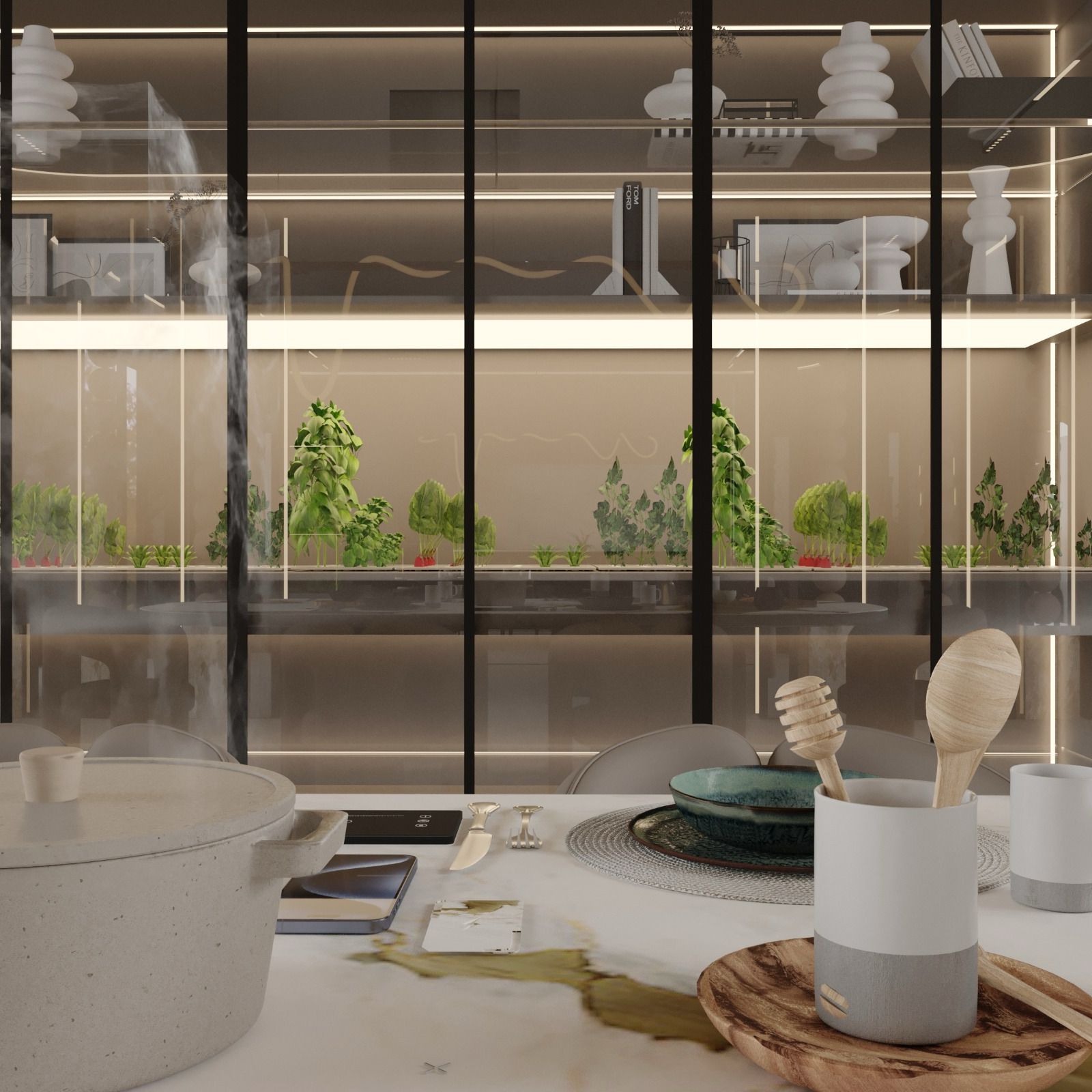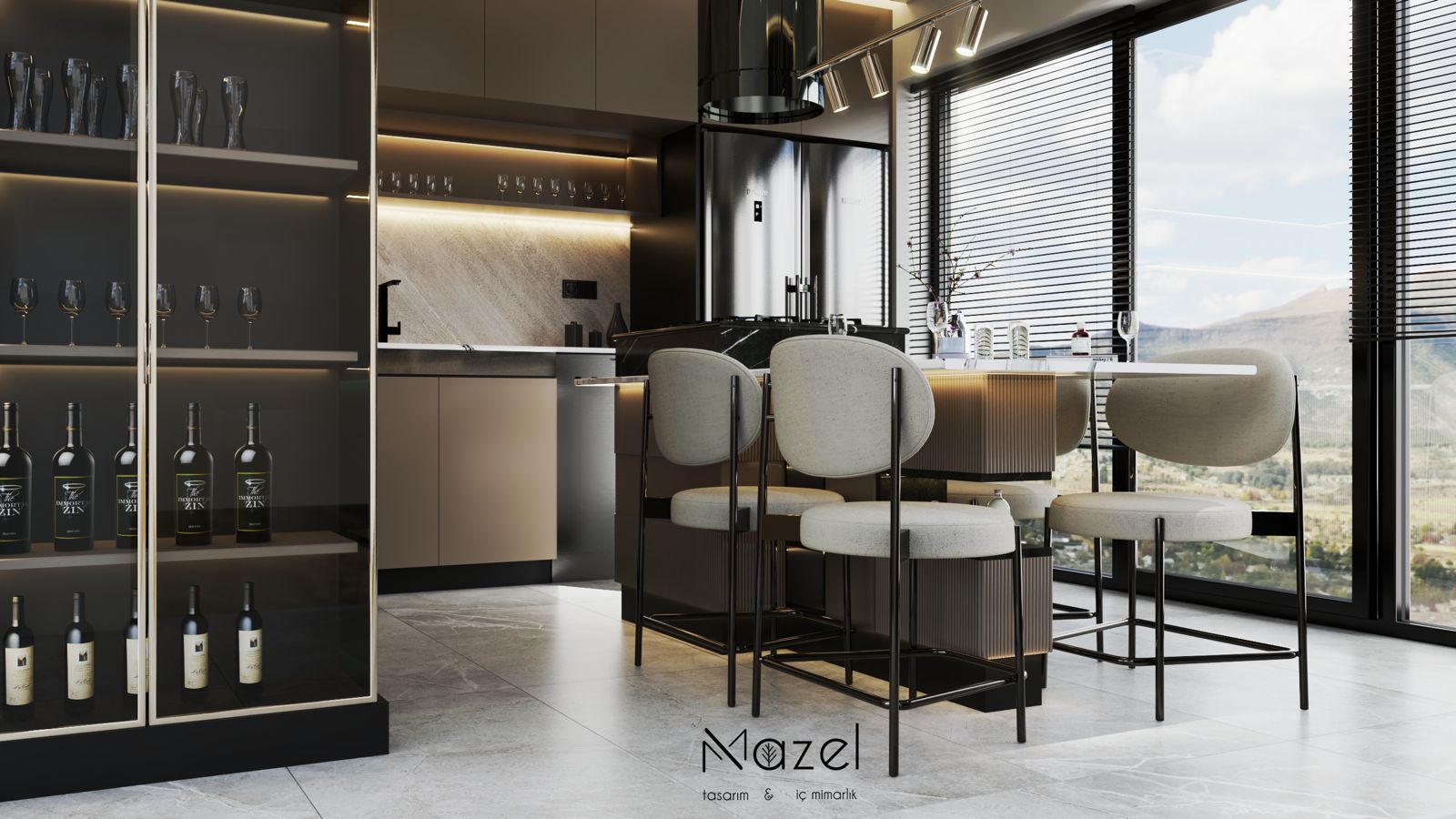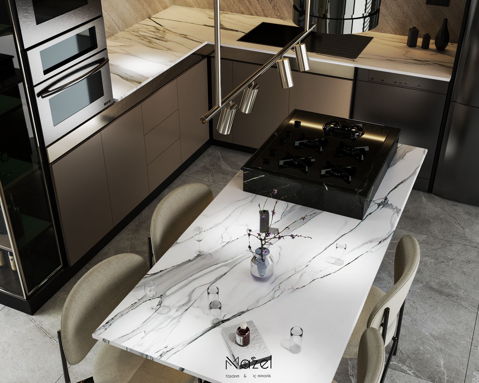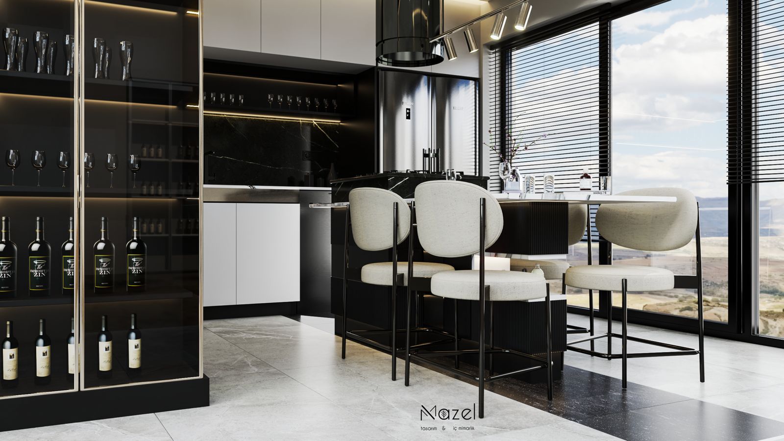 Bu proje, "Transitional" (Geçişsel) tasarım dilini benimseyerek, klasik "Shaker" stilinin sıcaklığını modern endüstriyel detaylarla harmanlayan ferah bir mutfak deneyimi sunar. Mekanın merkezine konumlanan geniş ada ünitesi, doğal meşe dokusu ve beyaz mermer tezgahın birlikteliğiyle hem fonksiyonel bir hazırlık yüzeyi hem de sosyal bir odak noktası oluştururken; çevreleyen gri mat lake dolaplar ve simetrik açık raf sistemleri, depolama hacmini görsel olarak hafifletmiştir. Zemin döşemesinde kullanılan sıcak ahşap parke, yaşam alanıyla mutfağı ayıran siyah demir doğramalı kayar cam panellerin (sliding doors) grafik etkisiyle kontrast oluşturur; tavandaki siyah manyetik ray spotlar ve mat siyah kulp detayları ise mekana ritmik ve modern bir karakter kazandırır.
