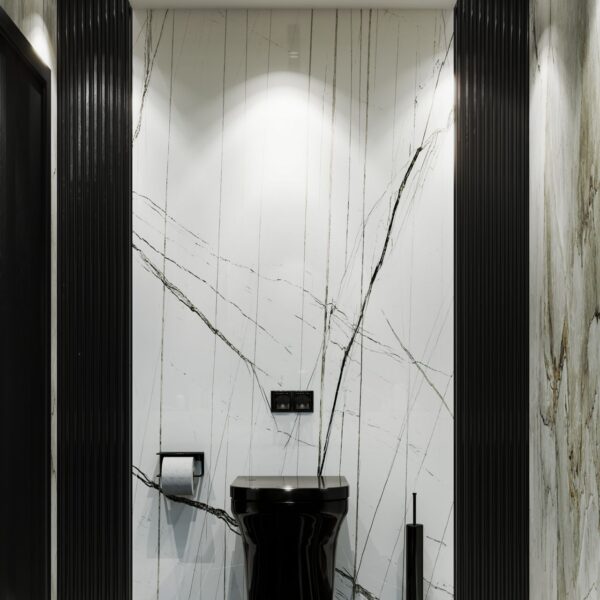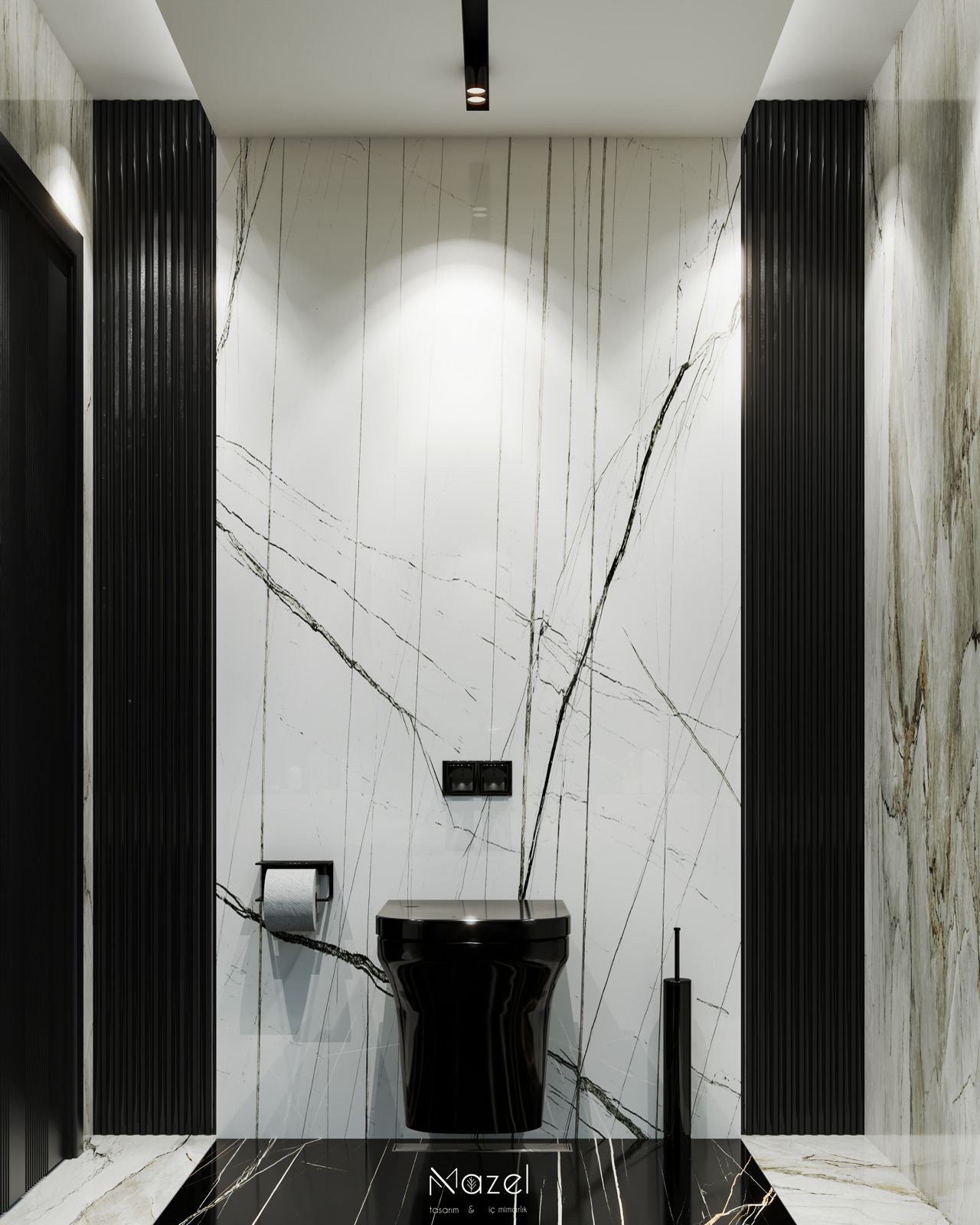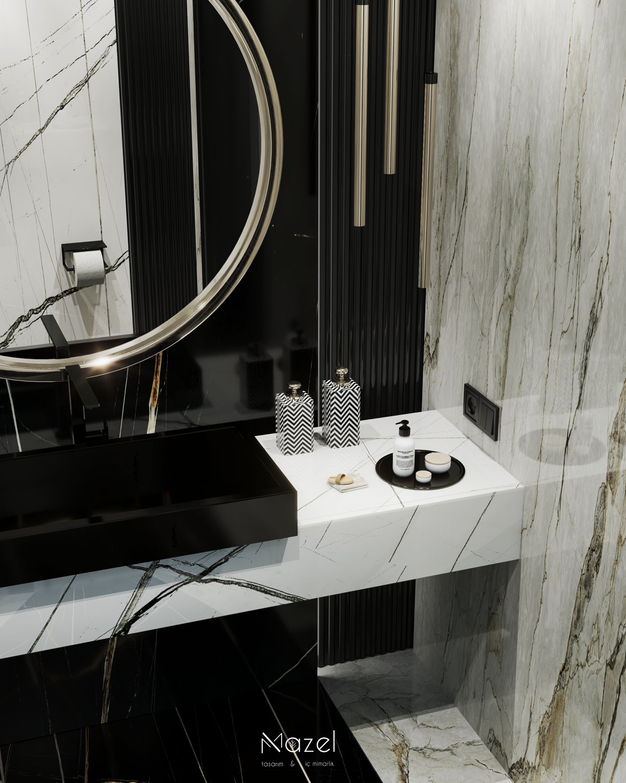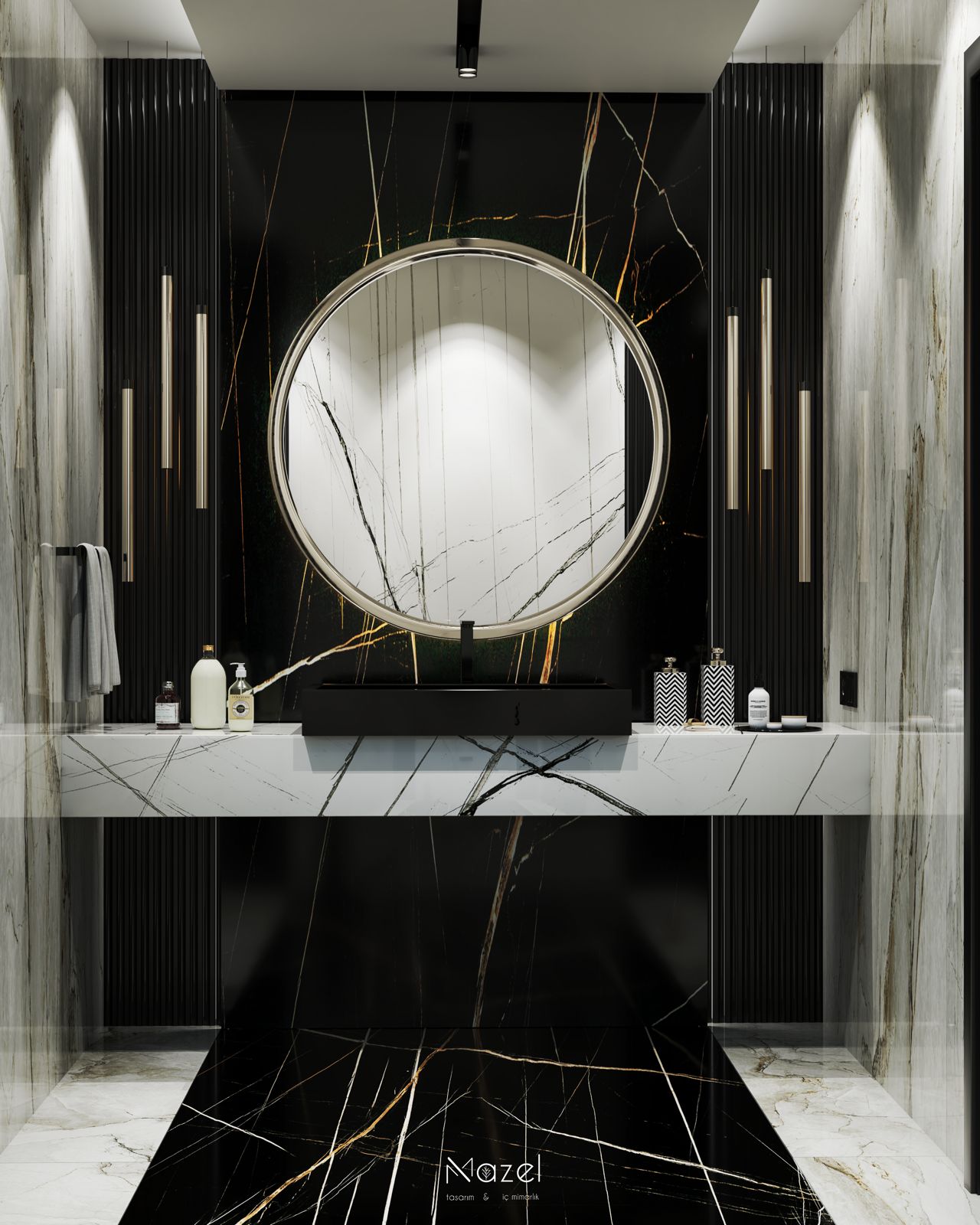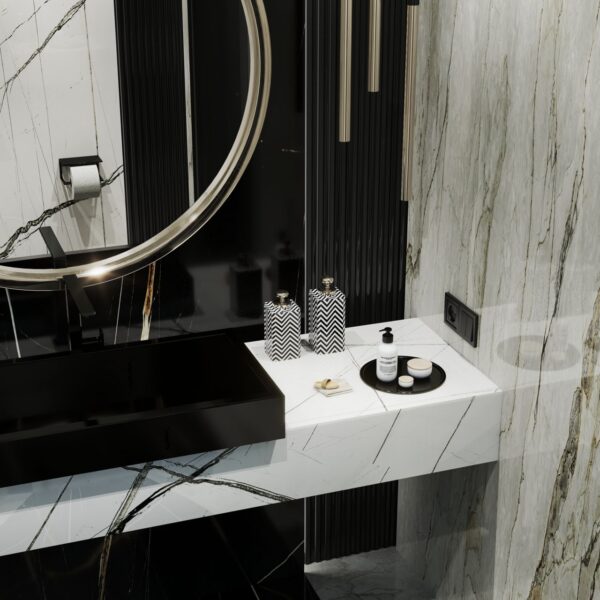 Bu ıslak hacim tasarımı, siyah ve beyaz mermer dokularının yarattığı yüksek kontrastlı "monokrom" estetiği, altın metal detaylarla zenginleştirerek dramatik bir lüks atmosferi kurgular. Lavabo ünitesinde odak noktası oluşturan altın çerçeveli dev dairesel ayna ve simetrik inen silindirik sarkıt aydınlatmalar, siyah arka plan üzerindeki altın damarlı (gold vein) mermer dokusuyla birleşerek mekana derinlik katan bir "mücevher kutusu" etkisi yaratır. WC nişinde ise beyaz zemin üzerine keskin siyah damarlı mermer kaplama kullanılarak görsel ferahlık sağlanmış; parlak siyah asma klozet (wall-hung) ve mat siyah aksesuarlar, bu fon üzerinde heykelsi bir duruş sergilemiştir. Her iki zonu da dikeyde sınırlandıran siyah oluklu (fluted) paneller, mekanın mimari yüksekliğini vurgulayarak dokusal bir bütünlük sağlar.