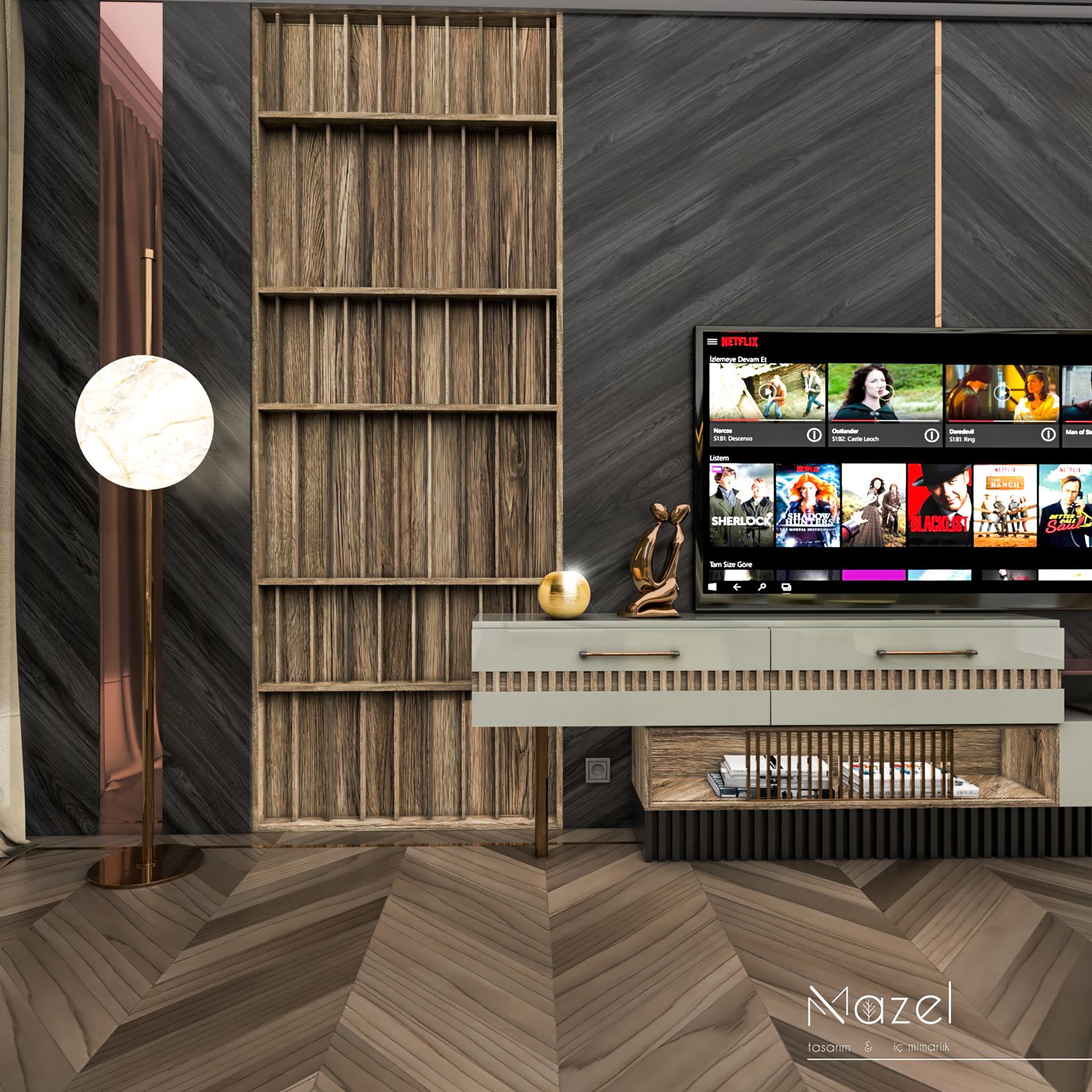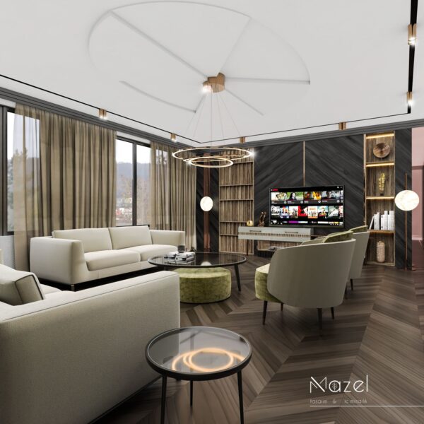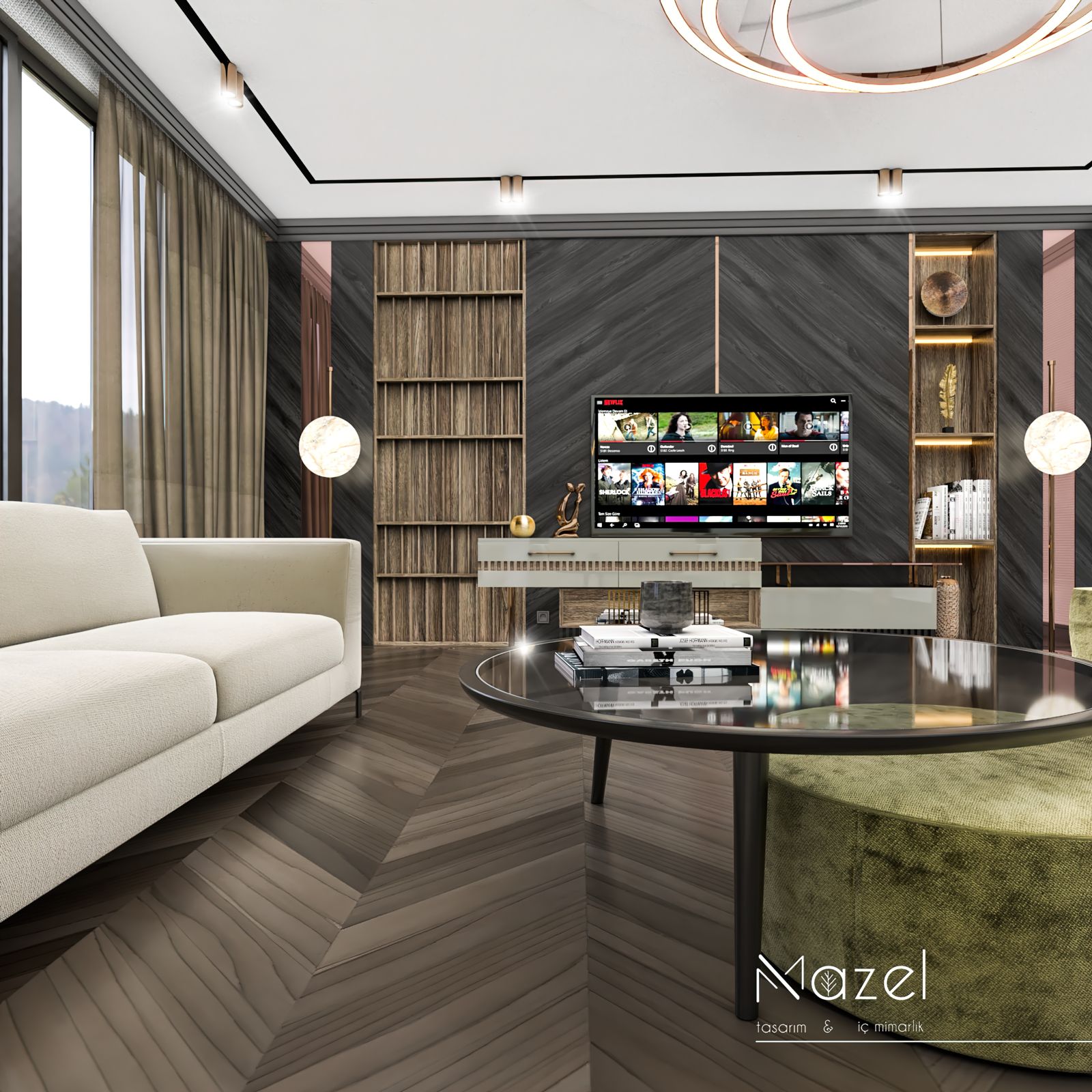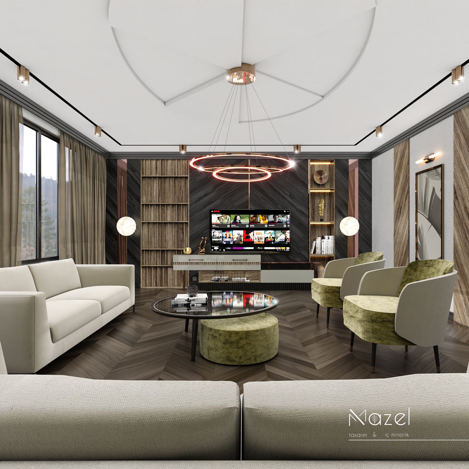 Bu oturma odası kurgusu, zemin ve dikey yüzeyler arasında kurulan güçlü geometrik diyalogla karakterize edilen modern ve maskülen bir atmosfer sunar. Mekanın zeminindeki koyu tonlu "Macar" (chevron) parke döşemesi, TV duvarındaki diyagonal hareketli ahşap panellerle görsel bir süreklilik sağlarken; bu koyu ahşap fon, entegre amber LED aydınlatmalı dikey kitaplık nişleri ve pirinç metal derz detaylarıyla parçalanarak mekana mimari bir ritim kazandırmıştır. Tavan planında alçıpan üzerine işlenen dairesel kalıp detayları ve merkezdeki heykelsi çift halkalı rose-gold avize, mekandaki köşeli hatları yumuşatırken; mobilya seçimlerinde tercih edilen zeytin yeşili ve krem tonlu kavisli kadife koltuklar ile cam tablalı dairesel orta sehpa kombinasyonu, çevresel siyah ray spotların sağladığı teknik aydınlatma altında sofistike bir dokusal denge yaratır.