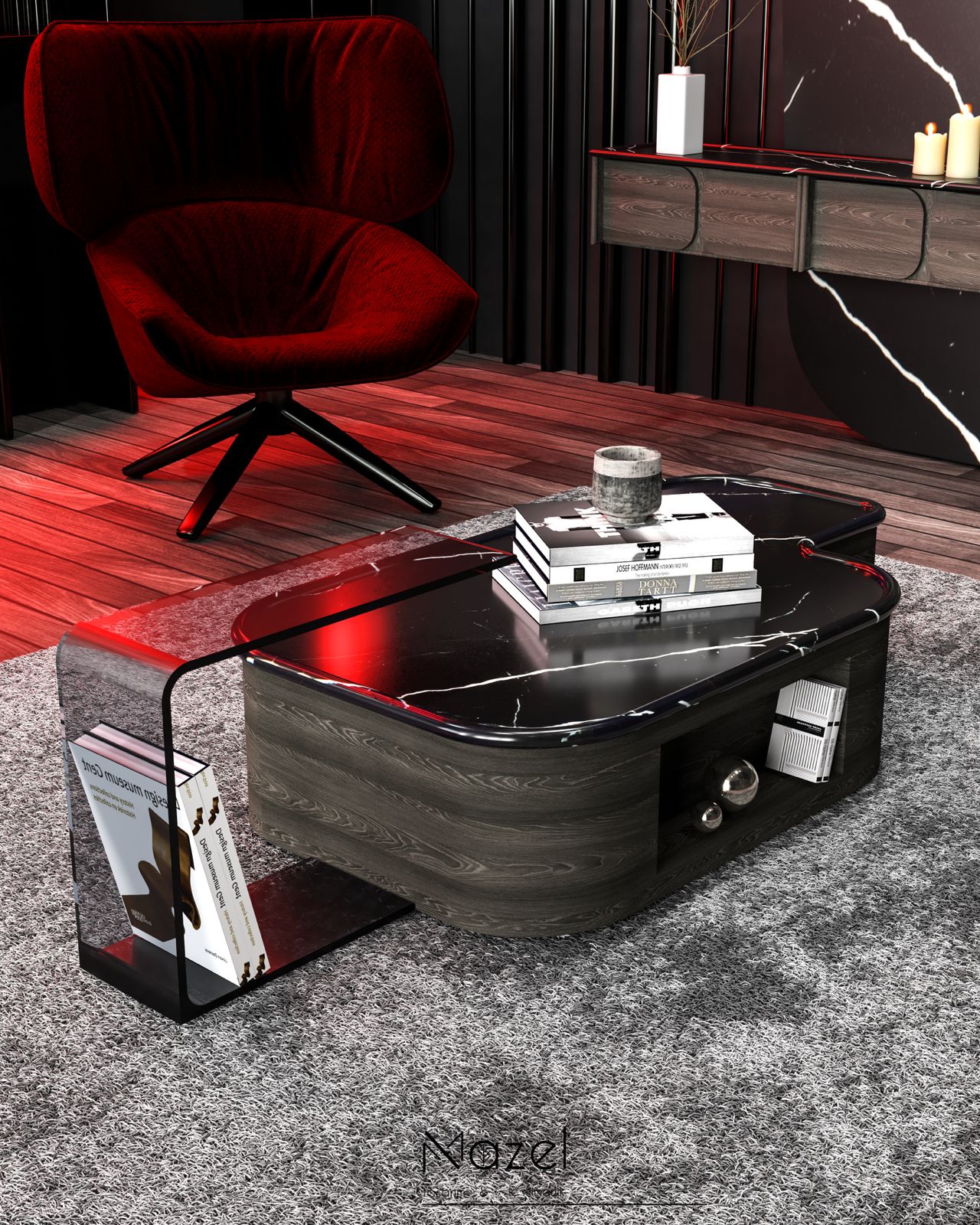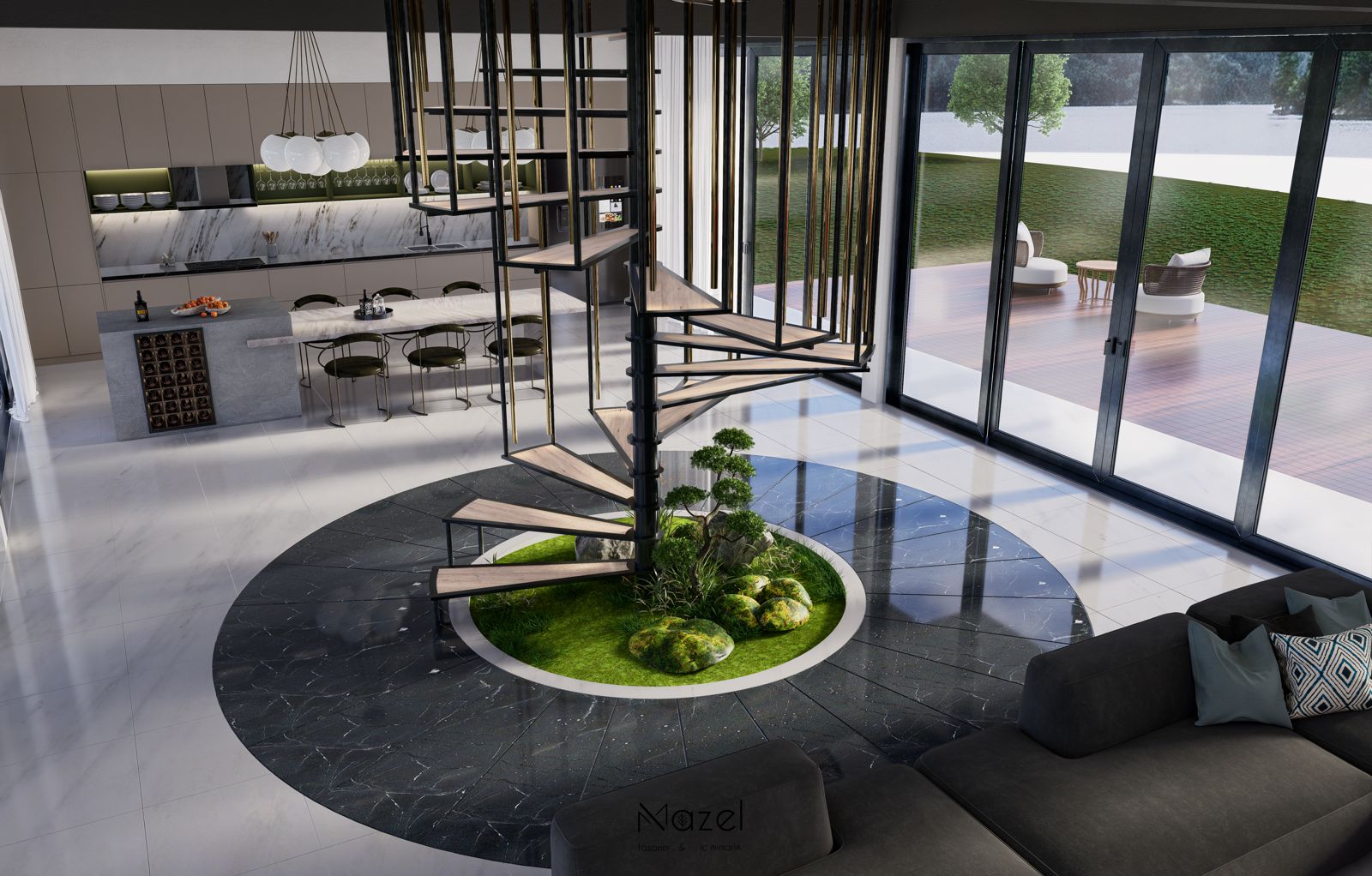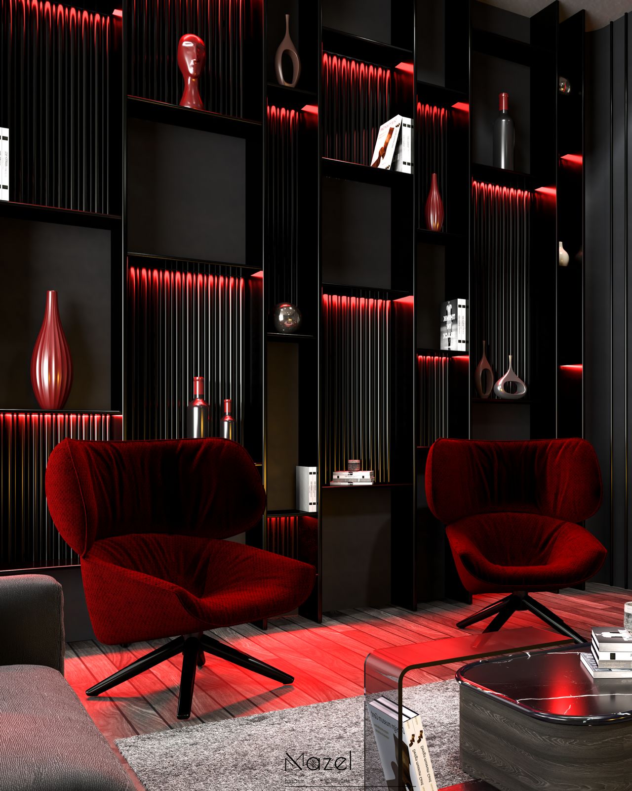 Bu oturma odası kurgusu, zemin ve dikey yüzeyler arasında kurulan güçlü geometrik diyalogla karakterize edilen modern ve maskülen bir atmosfer sunar. Mekanın zeminindeki koyu tonlu "Macar" (chevron) parke döşemesi, TV duvarındaki diyagonal hareketli ahşap panellerle görsel bir süreklilik sağlarken; bu koyu ahşap fon, entegre amber LED aydınlatmalı dikey kitaplık nişleri ve pirinç metal derz detaylarıyla parçalanarak mekana mimari bir ritim kazandırmıştır. Tavan planında alçıpan üzerine işlenen dairesel kalıp detayları ve merkezdeki heykelsi çift halkalı rose-gold avize, mekandaki köşeli hatları yumuşatırken; mobilya seçimlerinde tercih edilen zeytin yeşili ve krem tonlu kavisli kadife koltuklar ile cam tablalı dairesel orta sehpa kombinasyonu, çevresel siyah ray spotların sağladığı teknik aydınlatma altında sofistike bir dokusal denge yaratır.