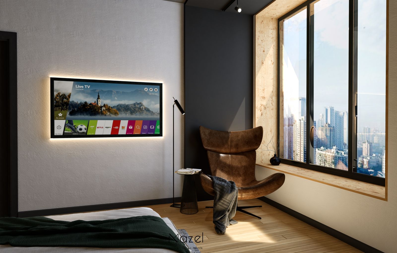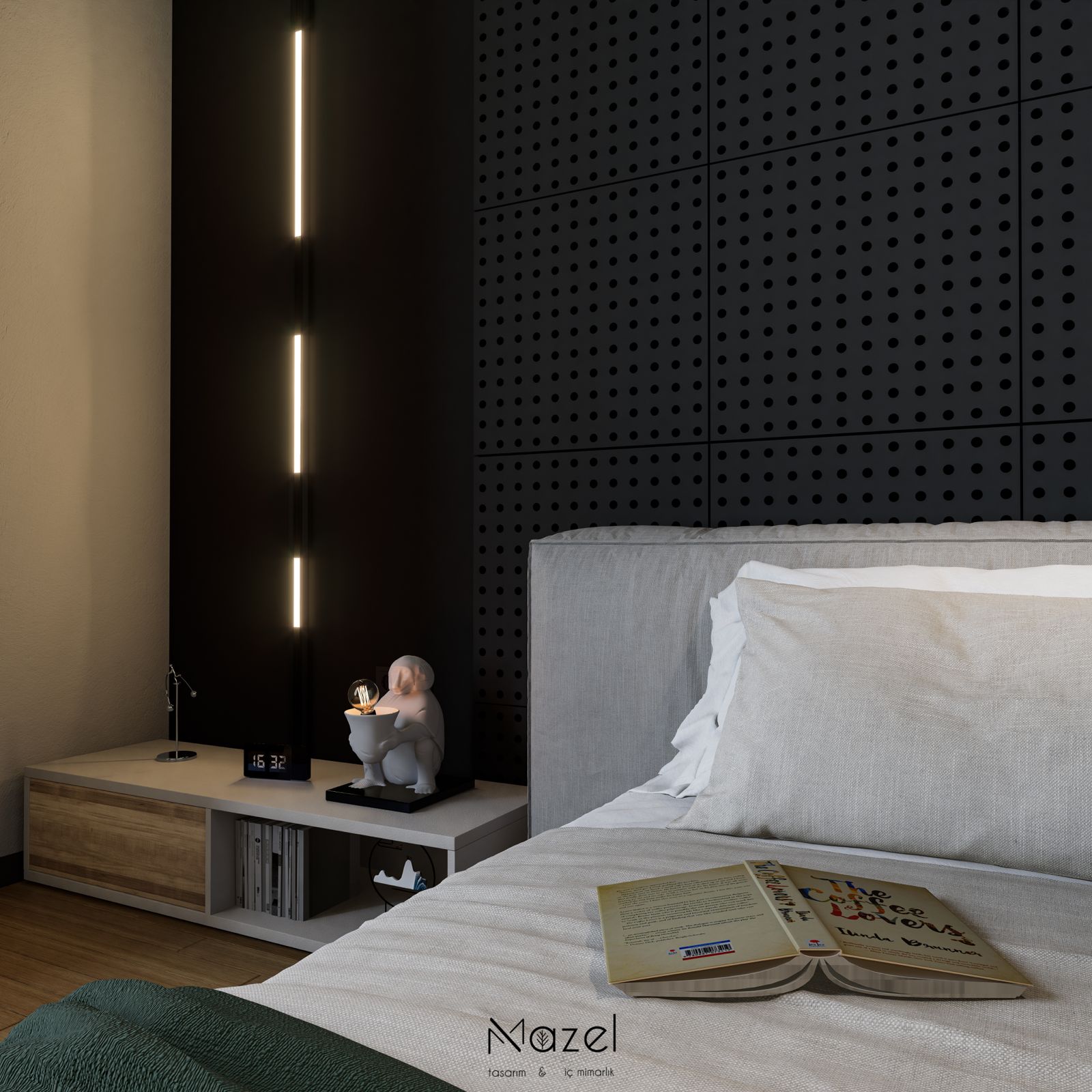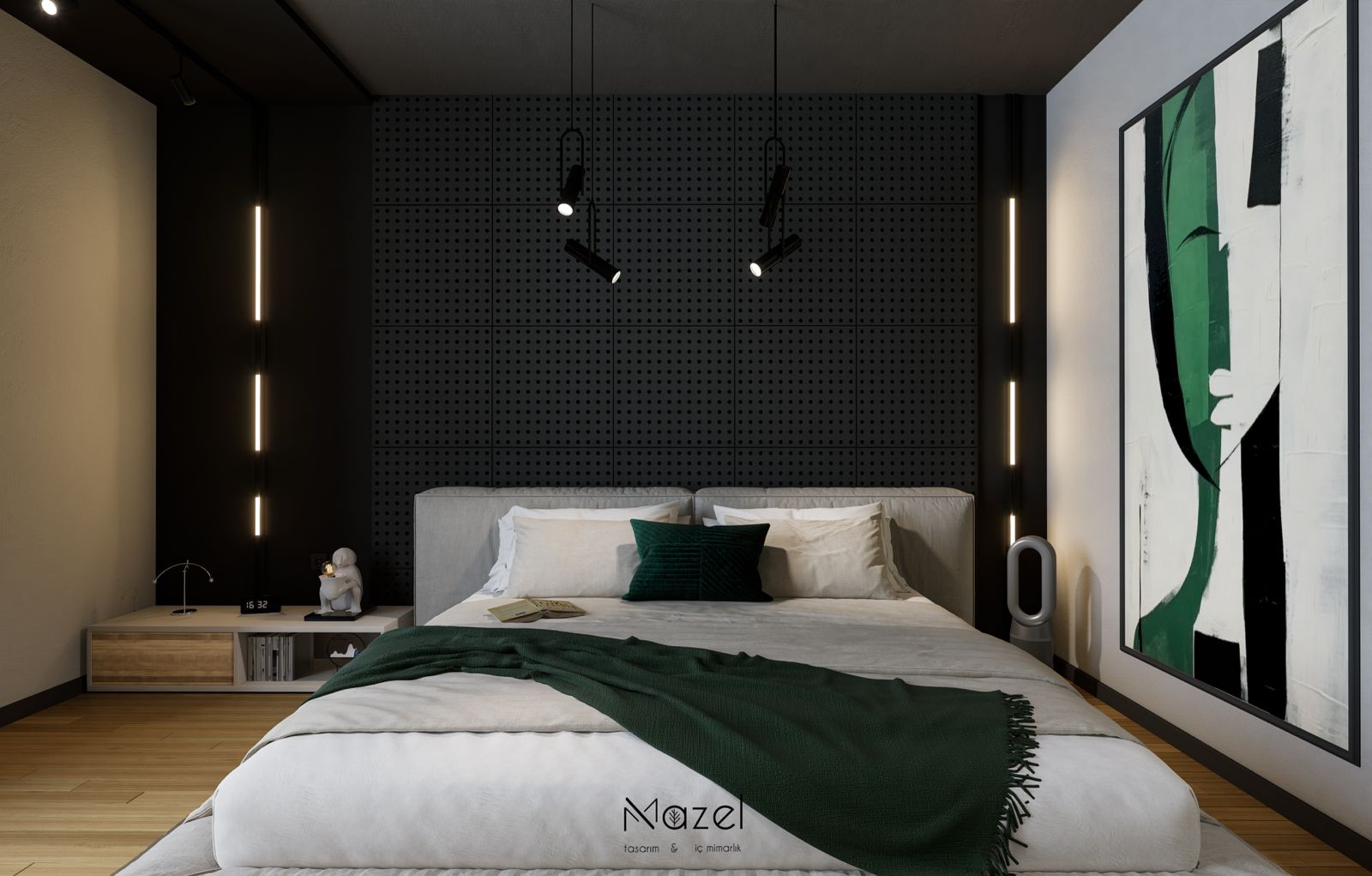 Bu modern yatak odası tasarımı, endüstriyel dokuların sıcak ahşap yüzeylerle dengelendiği, akustik konforun ön planda tutulduğu maskülen ve sofistike bir atmosfer sunar. Yatak başı duvarında uygulanan antrasit renkli perfore akustik paneller, mekana teknik bir derinlik kazandırırken; panelleri çerçeveleyen dikey entegre LED ışık kanalları ve tavandan sarkan siyah silindirik spotlar, odak noktasını dramatik bir şekilde vurgular. Mekanın renk paleti, büyük ölçekli soyut tablodaki ve yatak tekstillerindeki zümrüt yeşili tonlarıyla canlandırılmış; karşı duvarda ise brüt beton görünümlü tekstürlü duvar kaplaması ve arkadan aydınlatmalı (ambilight) TV ünitesi ile modern bir fon oluşturulmuştur. Pencere önündeki ahşap çerçeveli niş ve taba rengi deri berjer, gün ışığını içeri alan geniş cam cephe ile bütünleşerek, şehir manzarasına hakim keyifli bir dinlenme zonu yaratır.